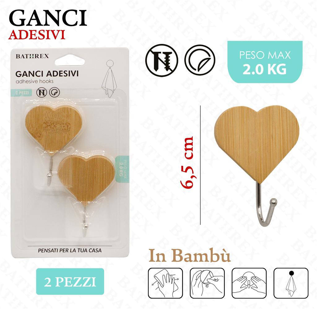 Scopri l'eleganza naturale dei Bathrex Ganci Bambu Cuori 2Pz, l'accessorio perfetto per aggiungere stile e ordine alla tua casa. Realizzati in vero bambù, un materiale sostenibile e resistente, uniscono estetica e funzionalità in un design a forma di cuore. Ideali per bagno, cucina, ingresso o camera da letto, donano un tocco caldo e accogliente a qualsiasi ambiente. L'installazione è semplice e veloce, senza bisogno di forare, grazie all'adesivo ad alta tenuta. Scegli una soluzione pratica e decorativa per organizzare con gusto i tuoi spazi.