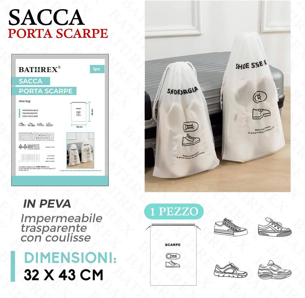 Scegli Bathrex Sacco Porta Scarpe per un organizzazione intelligente e igienica. Le sue caratteristiche impermeabili e la chiusura a prova di viaggio garantiscono sicurezza in ogni spostamento. Il design curato si adatta a ogni stile, dal business al casual. Un accessorio essenziale per proteggere e prolungare la vita delle tue calzature.
