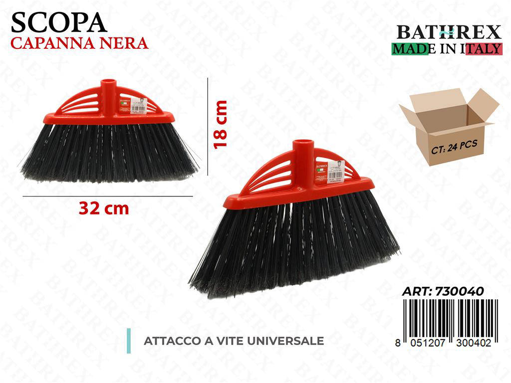Progettata per durare, Bathrex Scopa Capanna Nera unisce efficienza e resistenza con un estetica curata. Perfetta per case, uffici, negozi e laboratori, offre prestazioni costanti giorno dopo giorno. Le sue setole ad alta densità e la testa a capanna wide accorciano i tempi di pulizia senza compromessi. Scegli Bathrex per una pulizia precisa, rapida e senza graffi.