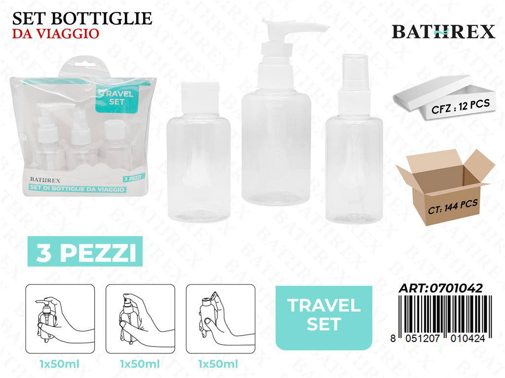 Con Bathrex Set 3Pz Bottiglie da Viaggio 50ml organizzi al meglio il tuo beauty on-the-go. Le dimensioni compatte ottimizzano lo spazio senza rinunciare alla praticità. Perfette per vacanze, lavoro, palestra e weekend fuori porta. Scegli la sicurezza, la comodità e l ordine, ovunque tu vada.