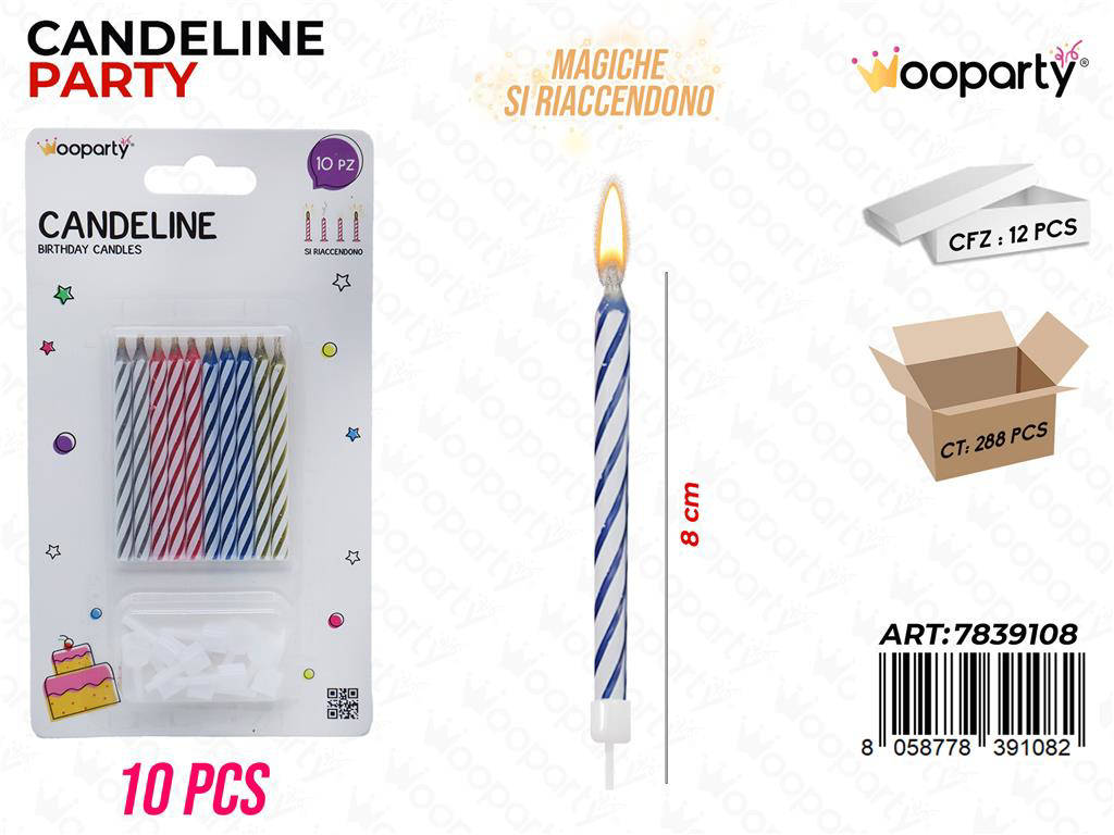 Scegli le Candeline Magiche Col. Ass. 10Pcs 8cm per trasformare un semplice soffio in un ricordo indimenticabile. Il loro effetto auto-riaccendente è un classico intramontabile delle feste, adatto a tutte le età. Grazie ai colori assortiti, si adattano perfettamente a ogni decorazione e stile. Aggiungile al carrello e prepara una sorpresa divertente e sicura per il tuo prossimo evento.