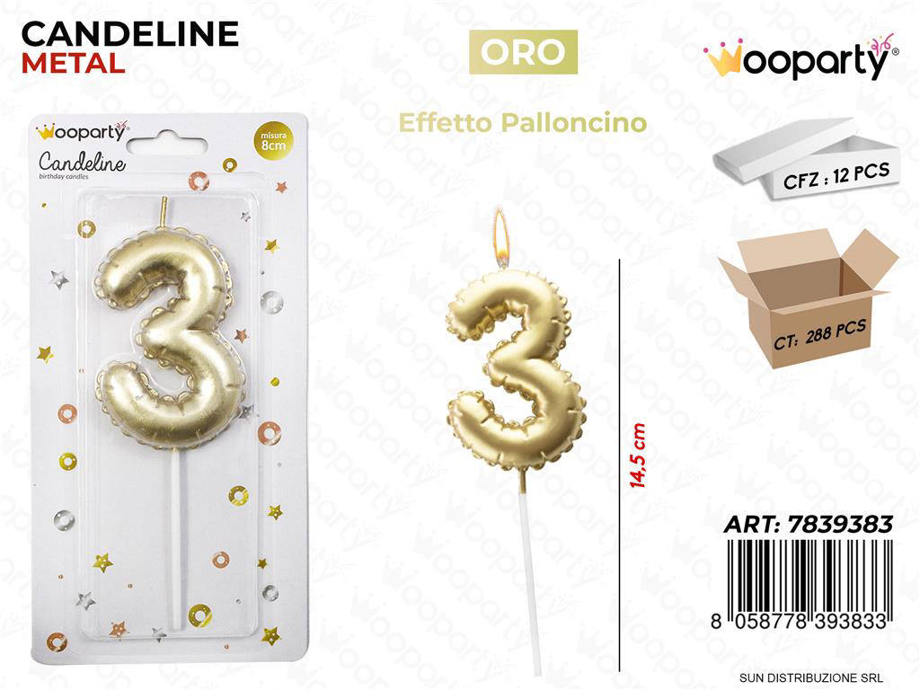 Illumina ogni festa con le Candeline Oro Metal a forma di palloncino numero 3 da 14,5 cm. Un tocco elegante e brillante per compleanni, anniversari e ricorrenze speciali. La finitura oro metallizzato cattura la luce, valorizzando la torta e l allestimento. Facili da posizionare, sono perfette per foto memorabili e coordinabili con altri decori. Ideali per party tematici gold, eventi glamour e set fotografici.
