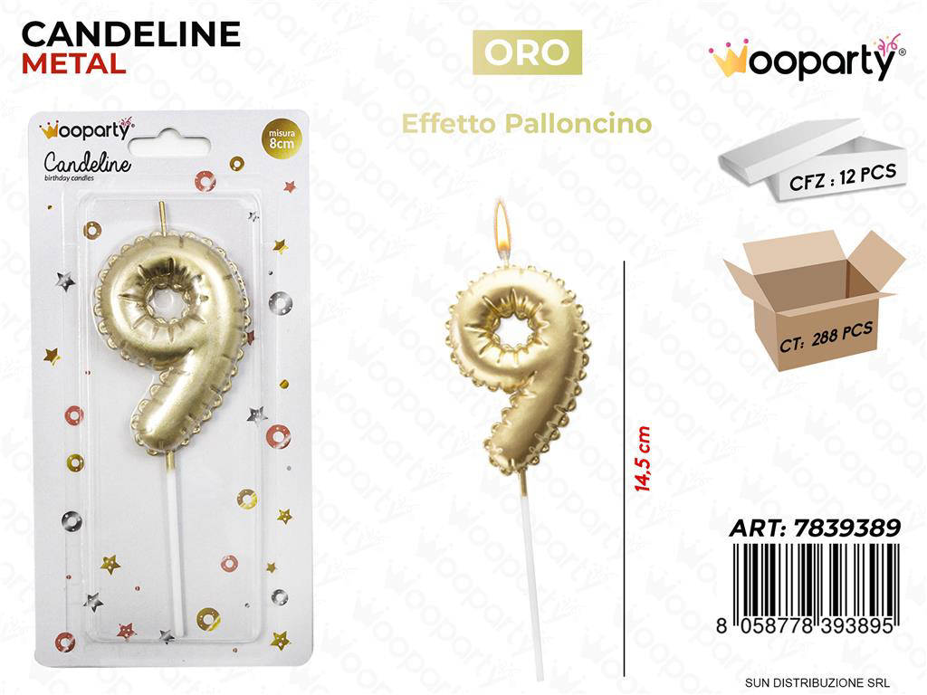 Festeggia con stile il tuo evento speciale con la Candelina Oro Metal a forma di Palloncino Numero 9 (14,5 cm). Il suo effetto metallizzato dona un tocco elegante e brillante alla torta, perfetto per compleanni, anniversari e ricorrenze. Facile da inserire e stabile, si abbina a qualsiasi tema decorativo. Ideale per set fotografici e allestimenti di tendenza, fa risaltare ogni scatto. Confezione pratica da 12 pezzi per feste, pasticcerie e party planner.