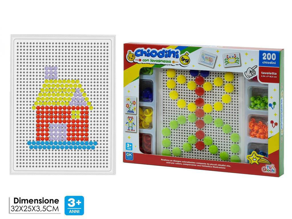 Scopri i Chiodini con Lavagnetta 200 pezzi, il set creativo perfetto per stimolare fantasia, coordinazione e apprendimento. Ideale per bambini, scuole e attività ricreative, offre ore di gioco educativo in totale sicurezza. La lavagnetta inclusa consente di comporre disegni, lettere e numeri in modo semplice e divertente. Il formato compatto lo rende pratico da portare in viaggio o a casa di amici. Un gioco senza tempo, pensato per crescere con il bambino.