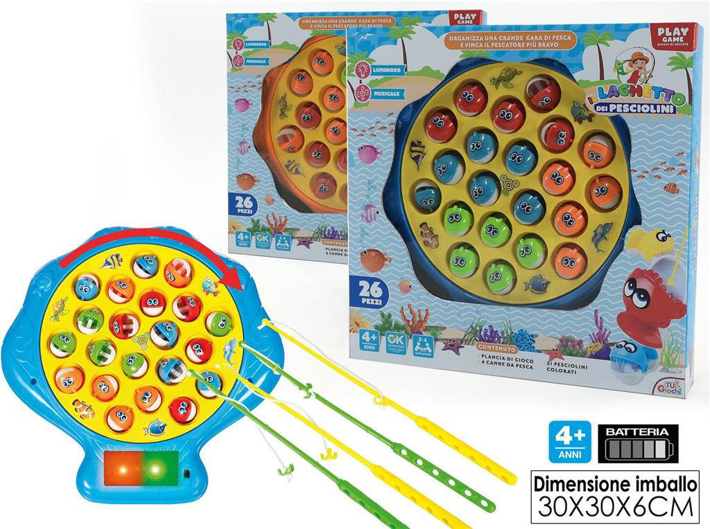 - 26 pezzi completi di accessori: canne da pesca, pesciolini e elementi del laghetto per attività multiple e gioco strutturato.