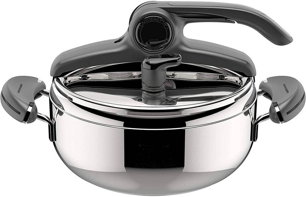 La Pentola a pressione MIA LAGOEASY'UP rappresenta oggi un'innovazione senza precedenti grazie all'esclusiva LagoEasy'Up Technology che permette un movimento di apertura e chiusura del coperchio più- semplice e senza sforzo. E' inoltre dotata di ben 6 sistemi di sicurezza e della valvola a scarico verticale del vapore. Ha un Fondo a 3 strati IRRADIAL PLUS per una perfetta diffusione del calore.