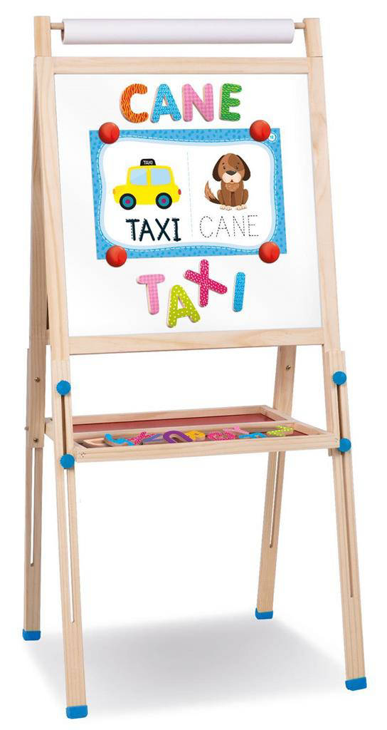 Una maxi lavagna da terra realizzata in legno di alta qualità. Con un ricco kit di giochi educativi, permette al bambino di imparare a leggere e scriv