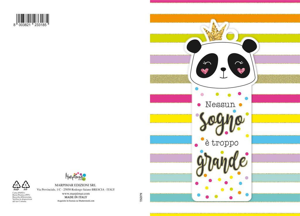 Scopri Auguri Panda Segnalibro TSD79 di Marpimar: un segnalibro dal design tenero e raffinato, perfetto per accompagnare ogni lettura. Realizzato con materiali di qualità, unisce funzionalità e stile in un accessorio unico. L'illustrazione del panda trasmette dolcezza e serenità, rendendolo ideale per regali e ricorrenze. Leggero e resistente, è pensato per non rovinare le pagine e per durare nel tempo. Un piccolo dettaglio che valorizza ogni libro e ogni momento di lettura.
