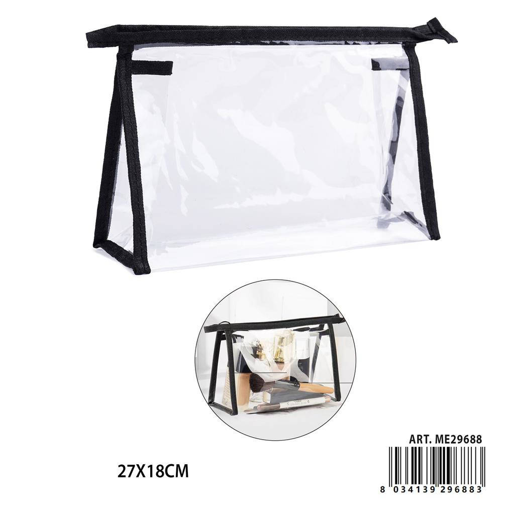 Scopri Melissa Borsa Porta-Tutto in PVC trasparente con profili neri, dimensioni compatte 27x18 cm, ideale per organizzare e proteggere i tuoi oggetti quotidiani. Il design trasparente ti consente di identificare il contenuto a colpo d'occhio, riducendo i tempi di ricerca. La chiusura sicura mantiene tutto al suo posto durante gli spostamenti in ufficio, a scuola o in viaggio. Materiali resistenti e facili da pulire garantiscono durata e praticità nel tempo. Un accessorio versatile e moderno, perfetto per borse, zaini e valigie.
