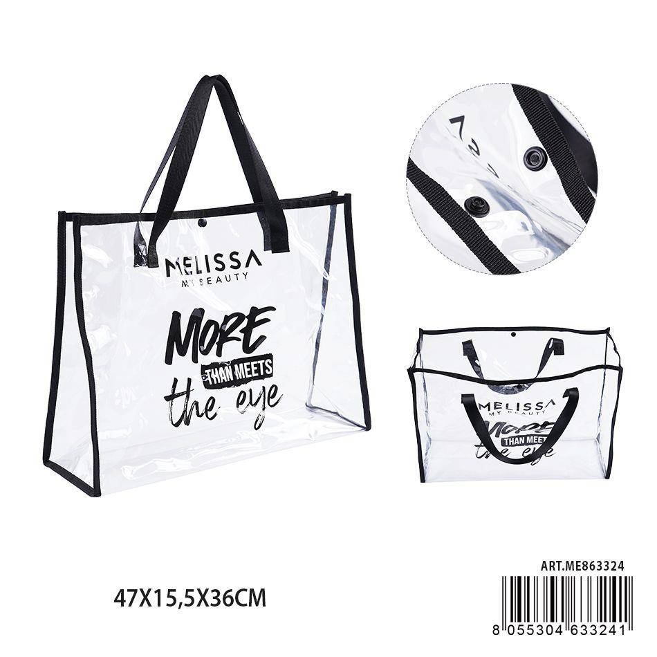 Scopri Melissa Borsa Shopper in PVC trasparente 47x15,5x36 cm: spaziosa, resistente e perfetta per ogni giorno. Il design trasparente dona un look moderno e raffinato, ideale per lavoro, shopping o viaggio. La struttura in PVC di alta qualità garantisce protezione contro pioggia e usura. I manici rinforzati assicurano comfort anche a pieno carico. Un accessorio versatile che unisce stile e funzionalità.