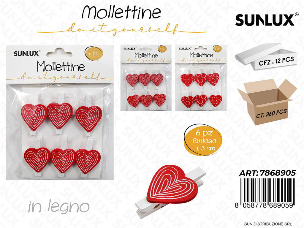 Porta un tocco di calore alle tue decorazioni con le Mollettine in Legno Cuori assortiti da 3 cm. Realizzate in legno naturale, sono l'accessorio perfetto per confezioni regalo, scrapbooking e allestimenti. Ogni confezione include 6 pezzi, ideali per personalizzare inviti, bomboniere e foto. Il design a cuore aggiunge un dettaglio romantico e delicato a qualsiasi progetto creativo. Semplici da usare, resistenti e riutilizzabili per ogni occasione speciale.