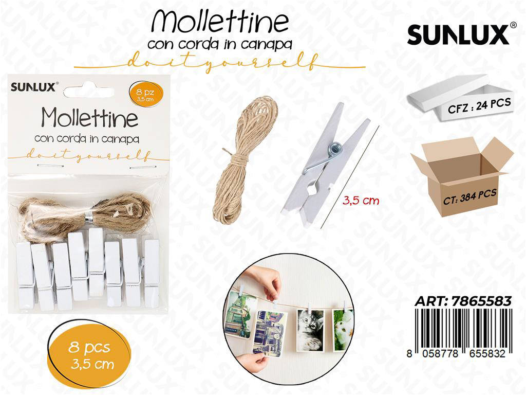 Scopri le Mollettine in legno bianche con corda in canapa, il set ideale per decorazioni creative, packaging artigianale e display fotografici. Ogni confezione include 8 pezzi da 3,5 cm, perfetti per progetti DIY e allestimenti eleganti. La finitura bianca dona un tocco pulito e moderno, mentre la corda in canapa naturale aggiunge calore e stile rustico. Resistenti e leggere, sono adatte sia per uso domestico che professionale. Un alleato versatile per eventi, vetrine, feste e home decor.