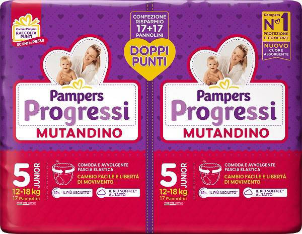 Scegli Pampers Progressi Mutandino Junior Taglia 5 per una protezione affidabile e un comfort che segue il tuo bambino in ogni avventura. La facilità d uso del formato mutandina rende i cambi più semplici, soprattutto fuori casa. L elevata assorbenza e la vestibilità elastica garantiscono serenità durante tutta la giornata. Confezione da 34 pannolini per una scorta ottimale e conveniente.