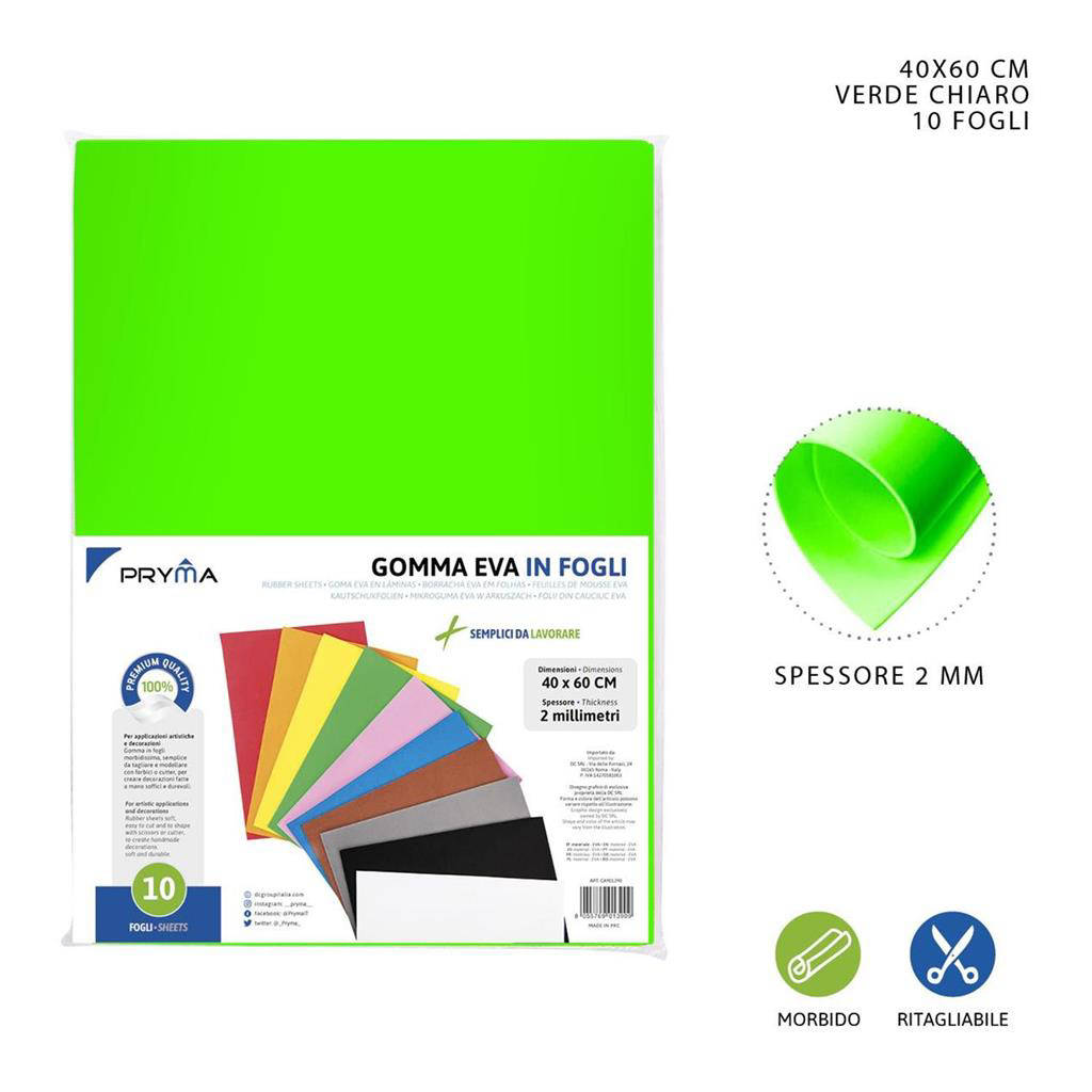 Scopri Pryma Foglio Gomma EVA 40x60 cm, spessore 2 mm, colore verde chiaro (cod. 0150198), la soluzione versatile per hobby creativi, modellismo e decorazioni. La sua superfice liscia e uniforme assicura tagli precisi e risultati professionali. Il materiale EVA è flessibile ma resistente, ideale per progetti scolastici e artigianali. Leggero e facile da lavorare, si adatta a incollaggi, sagomature e termoformature leggere. Un alleato indispensabile per maker, insegnanti e creativi.
