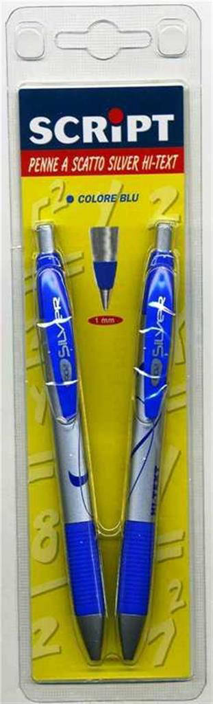 Scopri la Script Penna a Scatto Silver Hi-Text, il set da 2 penne blu pensato per chi pretende precisione e stile in ogni firma. Il corpo silver dal design moderno offre una presa confortevole e professionale. L inchiostro blu ad alta scorrevolezza garantisce tratti puliti e uniformi, senza sbavature. Il meccanismo a scatto rapido permette un utilizzo immediato, ideale per lavoro, studio e quotidianità. Perfetta per chi scrive molto e cerca affidabilità costante.