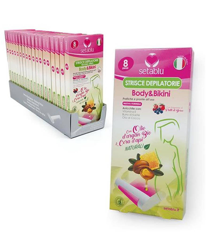 Le Strisce Body Bikini Setablu sono perfette per chi desidera un trattamento veloce ma efficace, con un attenzione speciale al benessere della pelle. L unione di Argan e Cera d Api offre un equilibrio tra efficacia e delicatezza. Usale regolarmente per mantenere una pelle visibilmente più liscia. Un alleato pratico per la tua beauty routine, anche in viaggio.
