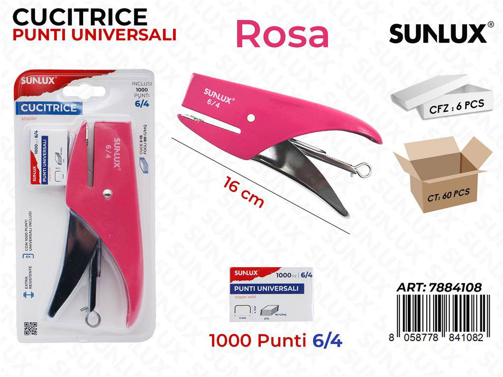 Scopri Sunlux - BL Cucitrice Fucsia con punti universali 6/4, confezione da 6 pezzi, codice 7884108. Una spillatrice compatta e affidabile pensata per ufficio, scuola e home office. Il design fucsia dona un tocco di colore alla tua scrivania senza rinunciare alla funzionalità. Struttura solida, impugnatura comoda e caricamento semplice per un uso quotidiano senza intoppi. Ideale per rilegare documenti in modo pulito e professionale.