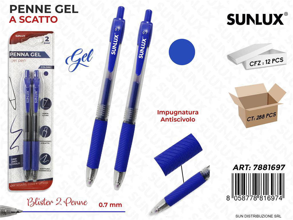 Scopri la precisione impeccabile della Sunlux - Penna Gel a Scatto Blu, ideale per ufficio, scuola e uso quotidiano. La punta da 0,7 mm garantisce una scrittura fluida e definita, riducendo sbavature e interruzioni. Il meccanismo a scatto offre praticità immediata, senza cappuccio da perdere. L inchiostro gel blu ad alta pigmentazione assicura testi leggibili e professionali. Confezione economica da 12 pezzi, organizzata in pratici blister da 2 penne.