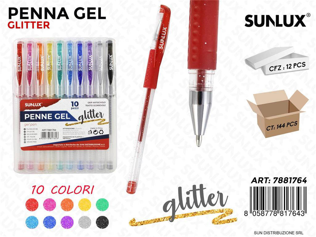 Confezione da 12 pezzi, ciascuna contenente 10 penne gel glitter, per un totale perfetto per uso personale, scolastico o rivendita. Un'ottima soluzione per laboratori creativi, attività scolastiche e negozi di hobbistica. Qualità Sunlux, sinonimo di affidabilità e convenienza. Scegli la creatività che brilla.