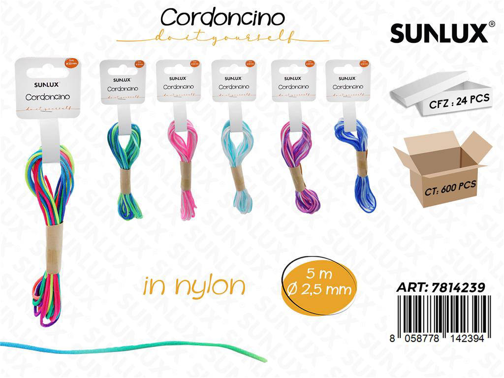 Sunlux Cordoncino in Nylon da 2,5 mm x 5 m è la soluzione affidabile per legature precise, decorazioni e fai-da-te. Realizzato in nylon resistente, garantisce durata e prestazioni costanti nel tempo. La finitura liscia evita sfilacciamenti e facilita i nodi sicuri. Il formato assortito offre colori versatili per ogni esigenza creativa o professionale. Ideale per casa, laboratorio, negozi e packaging.