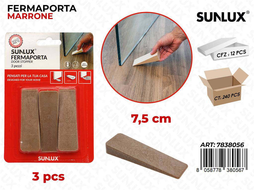 Blocca le porte in sicurezza con il set Sunlux Fermaporta Marrone 2.4 7.5 cm, confezione da 3 pezzi. Progettati per garantire stabilità quotidiana, questi fermaporta offrono una presa affidabile su diverse superfici. Il colore marrone discreto si integra facilmente con arredi moderni e classici. Ideali per casa, ufficio, negozio o ambienti ricettivi, aiutano a prevenire urti e chiusure improvvise. Un accessorio essenziale per proteggere porte, pareti e dita.