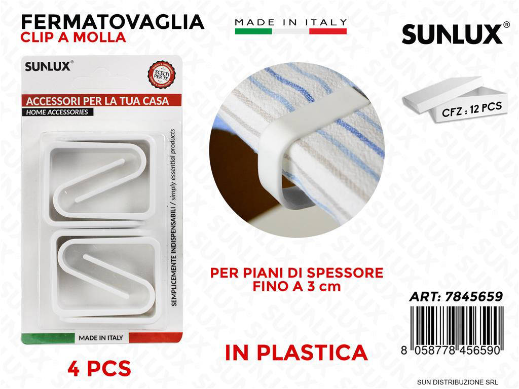 Mantieni la tua tovaglia sempre ben tesa e in perfetto ordine con i fermatovaglia a molla Sunlux, colore bianco, confezione da 4 pezzi. Progettati per tavoli da interno ed esterno, assicurano stabilità anche in presenza di vento o movimenti. Il design compatto si integra con discrezione su qualsiasi stile di tavolo. Realizzati con materiali resistenti, garantiscono lunga durata e facilità d'uso quotidiana. Ideali per giardini, picnic, terrazze, eventi e uso domestico.