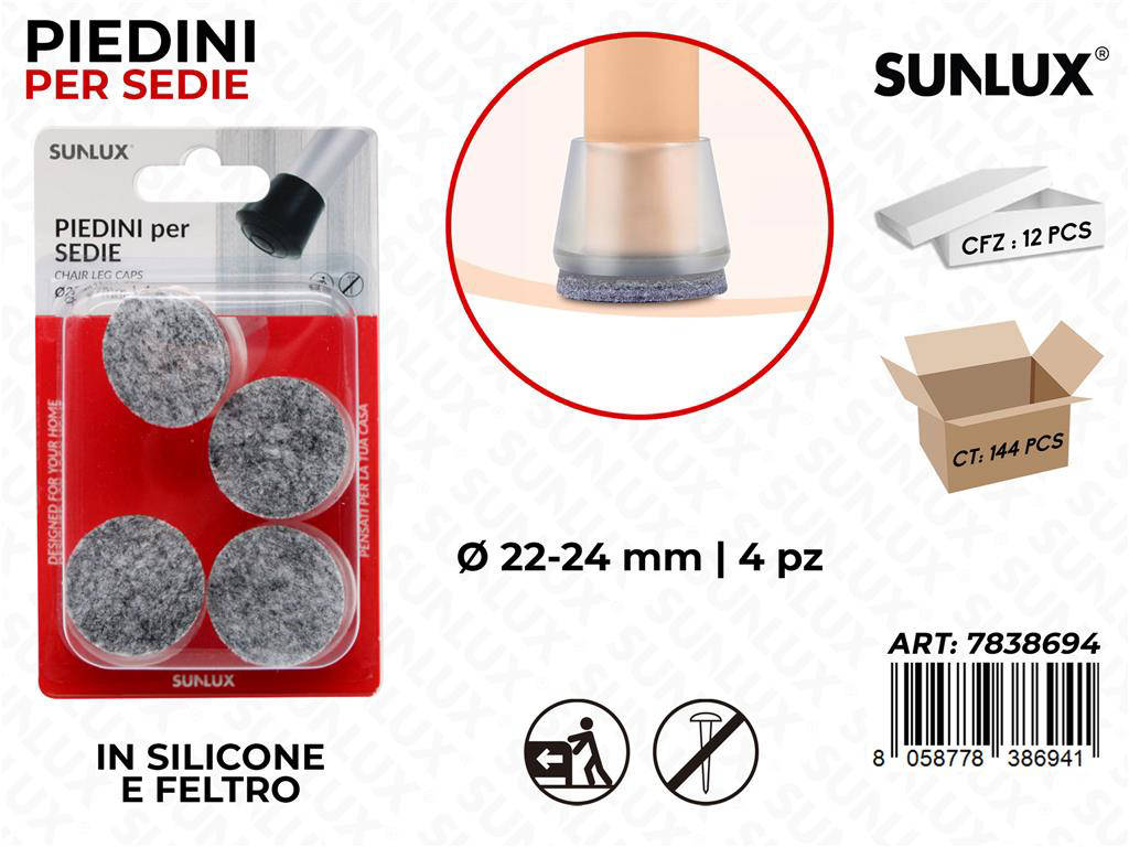Proteggi i tuoi pavimenti e migliora il comfort delle sedute con i Sunlux Piedini Sedie in Silicone con Feltro, confezione da 4 pezzi per gambe da 22 24 mm, venduti in pratico pack da 12. Facili da applicare, aderenti e discreti, sono la soluzione ideale per casa, ufficio e ristorazione. Il rivestimento in silicone avvolge la gamba senza graffiare, mentre il fondo in feltro garantisce uno scorrimento fluido e silenzioso. Dimentica rigature, segni e rumori fastidiosi: la protezione è immediata e duratura.
