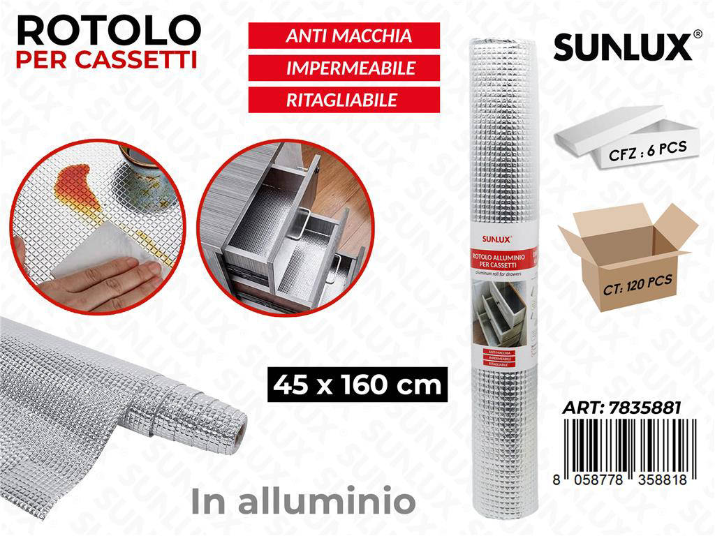 Scopri Sunlux Rot. Alluminio per Cassetti 45 160 cm, il rotolo in foglio d alluminio progettato per rivestire e proteggere i cassetti della cucina e della dispensa. Ideale per mantenere superfici pulite, igieniche e resistenti all umidità. La larghezza di 45 cm e la lunghezza di 160 cm offrono una copertura precisa e versatile. Facile da tagliare e applicare, aderisce in modo stabile senza lasciare residui. Migliora l ordine dei tuoi spazi con una soluzione rapida e professionale.
