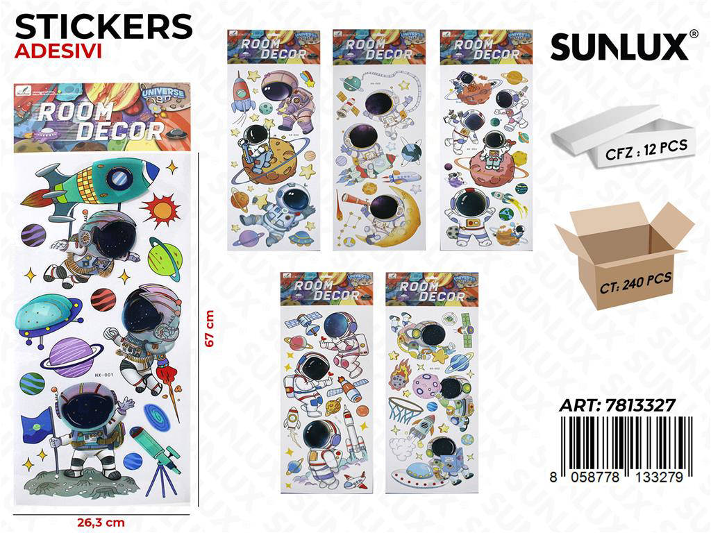 Porta un tocco di galassia nei tuoi ambienti con i SUNLUX Stickers ADV Space assortiti, dimensione 25x66 cm. Una soluzione decorativa rapida e d impatto per camere, uffici e vetrine retail. Gli adesivi sono facili da applicare e da rimuovere senza lasciare residui, ideali per chi ama rinnovare spesso lo stile. Le grafiche a tema spazio pianeti, razzi, stelle e astronauti sono stampate in alta definizione per colori brillanti e duraturi. La confezione comprende 12 pezzi assortiti per creare composizioni creative e coordinate.