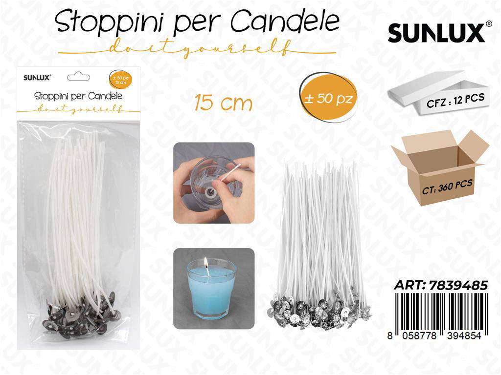 Accendi la tua creatività con i Sunlux Stoppini per Candele, confezione da 50 pezzi da 15 cm cadauno. Realizzati per garantire una combustione stabile, sono ideali per candele fai-da-te, artigianali e decorative. La lunghezza di 15 cm consente versatilità su vasetti, stampi e contenitori di diverse altezze. Compatibili con cera di soia, paraffina, cera d api e blend misti. Perfetti per hobbisti, artigiani e per chi desidera risultati professionali a casa.