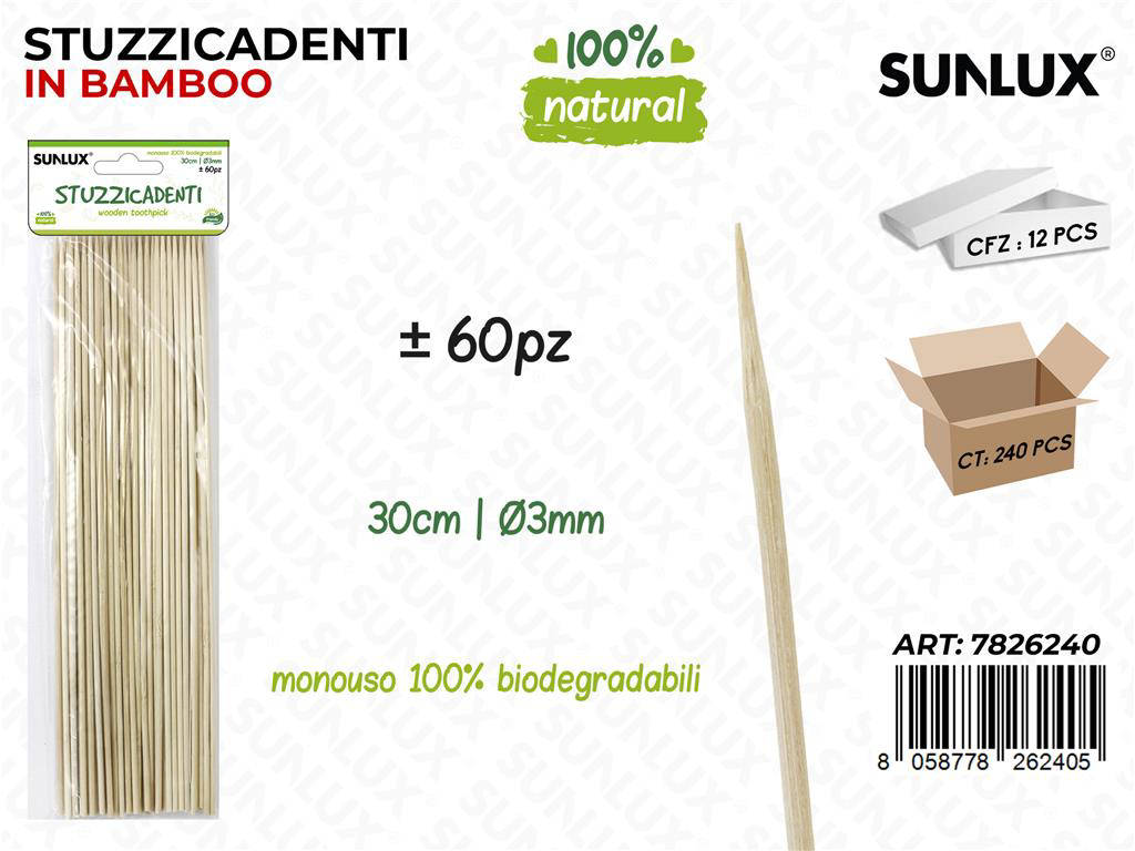 Scopri i Sunlux Stuzzicadenti in Bamboo, il set professionale ideale per buffet, cocktail, barbecue e food styling creativo. Ogni confezione offre 60 pezzi dal diametro di 3 mm e lunghezza di 30 cm, robusti e versatili. Realizzati in bamboo naturale, garantiscono resistenza, leggerezza e un estetica pulita. Perfetti per spiedini lunghi, frutta, finger food e decorazioni eleganti. Confezione da 12 pezzi per una scorta pratica e conveniente.