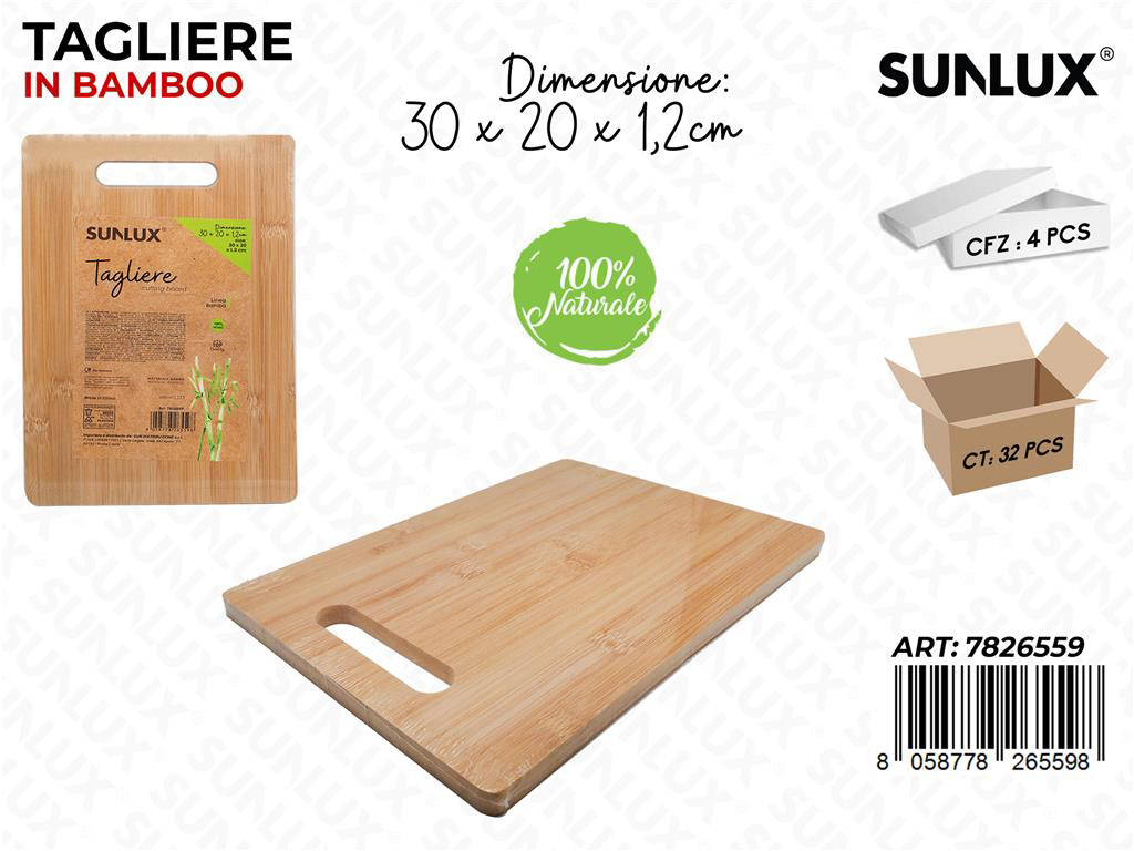 Porta in cucina naturalezza e resistenza con il Sunlux Tagliere in Bamboo, formato 30 x 20 x 1,2 cm, proposto in pratico set da 4 pezzi. Perfetto per tagliare, servire e impiattare con stile, unisce funzionalità ed estetica. Il bamboo, noto per la sua durezza e leggerezza, garantisce un uso quotidiano affidabile. Design sottile e maneggevole per adattarsi a ogni piano di lavoro. Un accessorio essenziale per cucine domestiche e professionali.