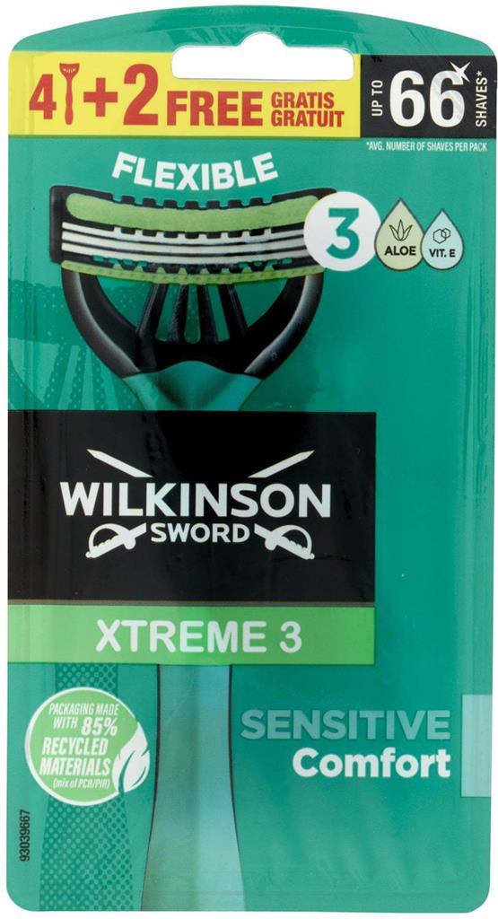 Scopri il rasoio usa e getta WILKINSON XTREME 3 NEW SENSITIVE, confezione 4+2 pezzi, pensato per una rasatura confortevole e protetta. Le tre lame flessibili si adattano ai contorni del viso, riducendo le irritazioni. La striscia lubrificante con aloe e vitamina E lenisce la pelle sensibile. Il manico antiscivolo garantisce controllo e precisione anche sotto la doccia. Un alleato quotidiano per una pelle liscia e ben curata.