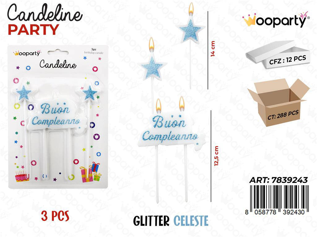 Rendi indimenticabile la tua festa con le Wooparty Candeline Buon Compleanno Glitter Celeste, confezione da 3 pezzi. La brillante finitura glitter dona un tocco di luce irresistibile a torte e dessert. Il colore celeste, elegante e moderno, si abbina perfettamente a party baby boy, battesimi, compleanni e baby shower. Facili da posizionare e da accendere, garantiscono una fiamma stabile e uniforme. Un dettaglio piccolo ma d effetto, ideale per foto e momenti da ricordare.