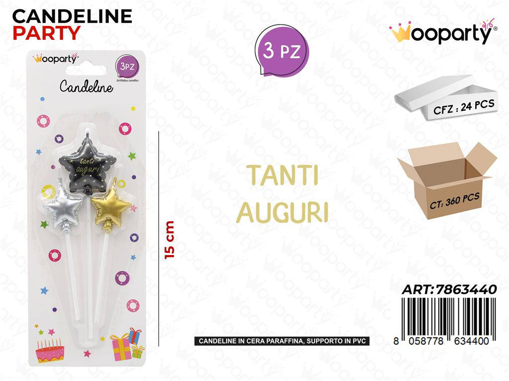 Festeggia ogni compleanno con stile grazie alle Wooparty Candeline Tanti Auguri, il dettaglio che rende speciale ogni torta. Questo set da 3 candeline, alte 15 cm ciascuna, offre un impatto visivo elegante e ben leggibile. Ideali per feste di bambini e adulti, si adattano a qualsiasi tema e colore. La fiamma stabile garantisce una combustione uniforme per il momento foto. Confezionate in pratici blister, sono perfette anche per rivenditori e party planner.